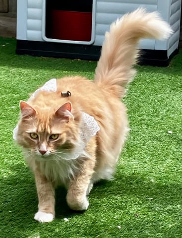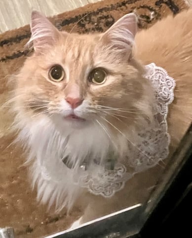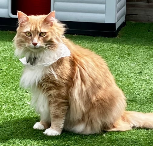 Willy Belle is a strikingly handsome tan Domestic Long Hair gentleman with soft medium-length fur, stylish white gloves and high boots, a fluffy white mane and a magnificent bushy tail.