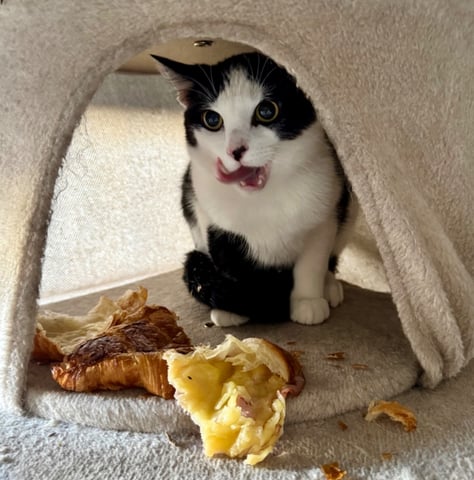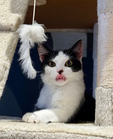 Panda Scott is a petite black-and-white kitten with a curious sparkle in his eyes and a cautious but loving nature. He adores other cats and feels safest when he has a feline friend to show him the ropes. Once he trusts you, he melts completely -- leaning into chin scratches, playfully batting toys, and doing his signature "mini jump" into your hand when he knows pats are coming.