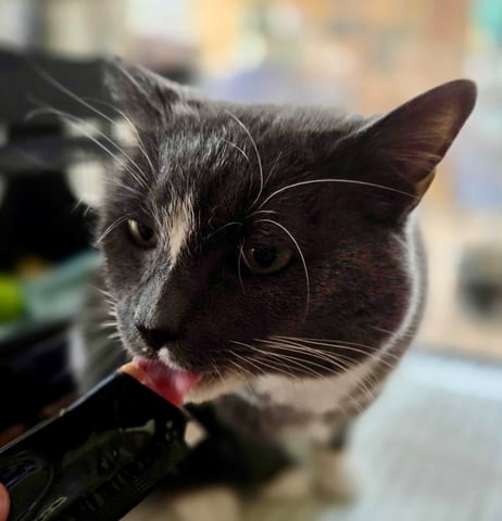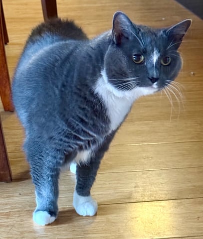 Misty is an 8-year-old domestic short hair queen with soft grey fur, a white blaze on her nose, white chest and socks, and a gloriously regal, cuddly silhouette. She's chatty, sassy and wonderfully expressive, with a clear understanding of her own boundaries. Misty adores affection when she knows and trusts you, happily settling in for cuddles and conversations, but she also enjoys her independence and her personal space.