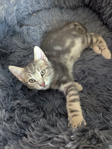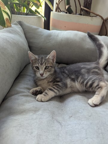 He just loves chasing, jumping and playing with toys. Once he's all tuckered out he'll curl up for a snooze. He loves a tickle and will greet with a sweet little mew to say hello.