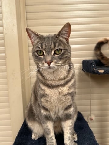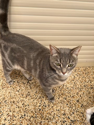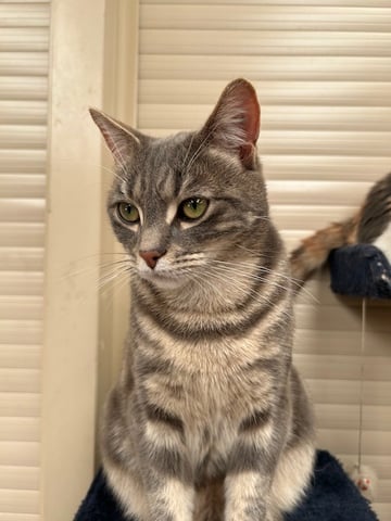 Dash is a 1 year and 3 month old male Domestic Short Hair with grey and white tabby markings. He is an affectionate, cuddly boy who absolutely adores human attention. He loves to play but is just as happy curling up on your lap for a long nap. Dash is extremely people-oriented, follows his humans around the house, and thrives on companionship. He is wonderful with children and has a gentle, loving nature that makes him an ideal family cat. He is relaxed, sweet and always ready for a cuddle when you are.