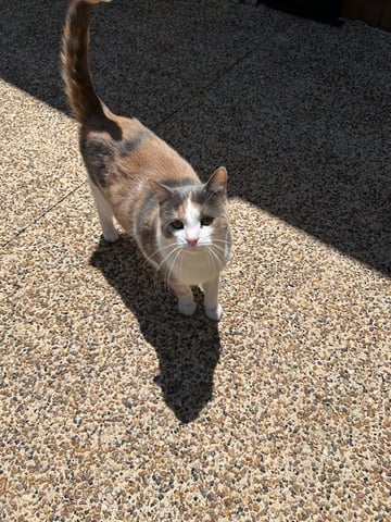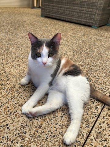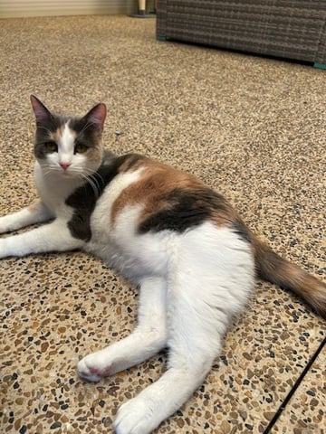 Hammy is a 1 year and 3 month old female Domestic Short Hair with calico markings of orange, grey and white. She is soft, affectionate and gentle, with a lovely balance of playful energy and quiet companionship. Hammy enjoys playing but especially loves her naps once she's had her fun. She prefers to cuddle beside you rather than being held for long periods. She is very good with children and enjoys being part of the household action. Hammy can be a little jumpy with sudden loud noises but settles quickly, and she is also an excellent little bug catcher around the home.