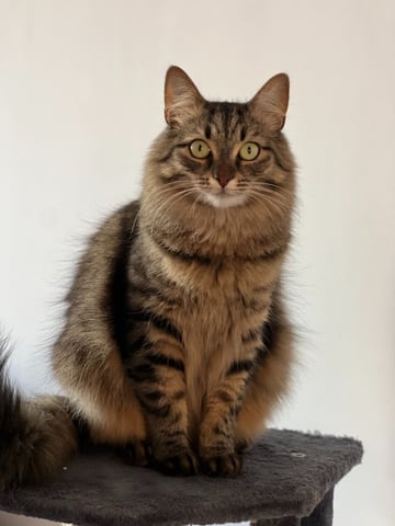 Lexi is a stunning medium-haired DMH x Siberian with chocolate tabby and fawn markings, a long curved fluffy tail and the softest feathered feet. She is gentle, affectionate, chatty and deeply devoted. Lexi is a true purring machine who adores pats, evening brushes, helping make the bed and curling up in warm sunny spots. She loves routine, thrives on calm companionship and will happily hold a conversation with you -- she even understands Greek! Lexi is shy at first but incredibly loving once she feels safe.