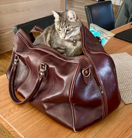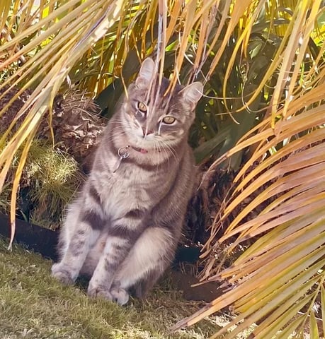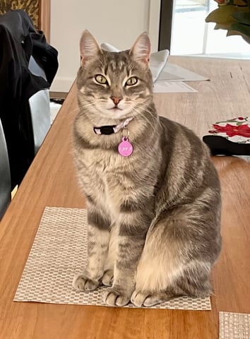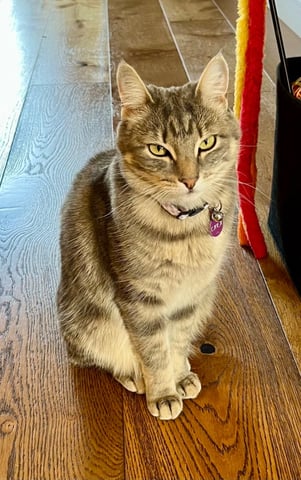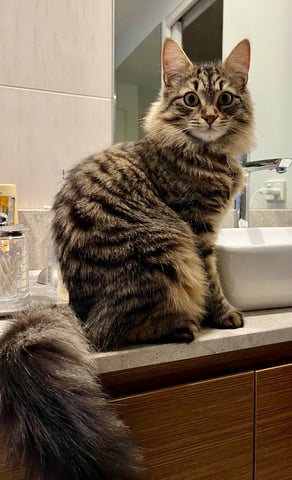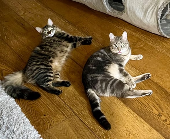 Cara is a short-haired grey cream tabby with beautiful green eyes and soft cream socks. She is sensitive, nurturing and quietly regal -- very much the emotional heart of the pair. Cara has a remarkable ability to sense when her humans are feeling stressed or anxious and will gently curl up on your chest to calm you. She is softly affectionate on her own terms, incredibly gentle with her paws, and has the sweetest pigeon-like purr. Cara loves morning cuddles, evening brushes, zoomies with her favourite hair tie, and quietly supervising household life like a loving little guardian.