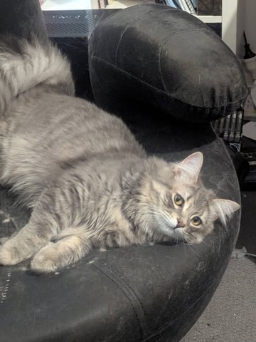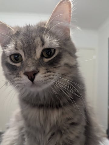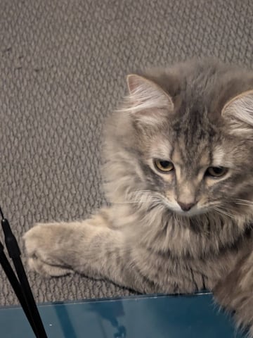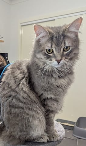 Wayne is a stunning silvery grey domestic long hair with an impressively fluffy coat and a famously curly tummy. He is a softer, quieter soul with a sensitive heart and a sweet, slightly awkward charm. Wayne can be shy and timid at first, but once he feels safe he becomes a gentle, affectionate companion. He is delightfully clumsy at times, occasionally tumbling off furniture in a way that suggests grace was optional, and sometimes meows with his tongue poking out -- a quirk that quickly wins hearts. He enjoys playtime, especially laser pointers, and loves nothing more than a plush bed and calm company.