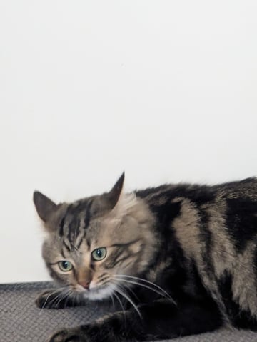 Wax is a striking beige and black tabby domestic long hair with an adorably cross-eyed expression and a huge, loving personality. He is chatty, cheerful, and endlessly amusing, with a goofy playfulness that brings constant joy. Despite his fun-loving nature, Wax is incredibly gentle, especially during play, and has a kind-hearted, affectionate temperament. One of his most endearing traits is his love of physical closeness -- he enjoys holding paws, being cradled like a baby, and curling up anywhere he fits, including desks. Shoelaces are a particular favourite, and he is always keen for cuddles on his terms.