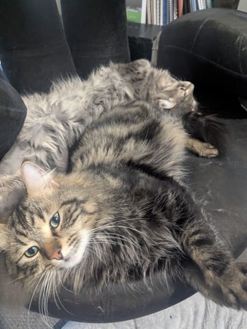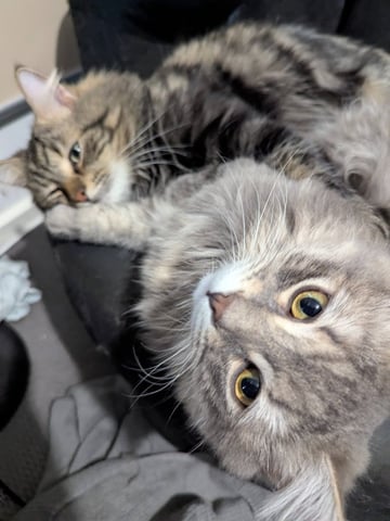 Wax (affectionately known as Waxillium) and Wayne wandered up to their foster carer's front door together, loudly announcing that the food situation required immediate attention. Initially mistaken for a mother-and-daughter duo, it was later discovered--after some strategic fluff investigation--that they were in fact two boys. From that moment on, they've been inseparable, forming a gentle, affectionate bond that has only grown stronger in care.