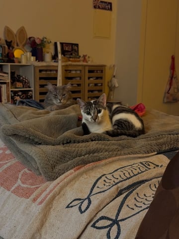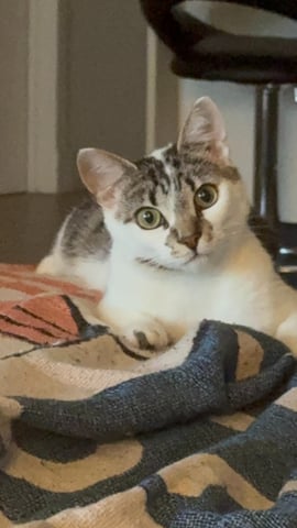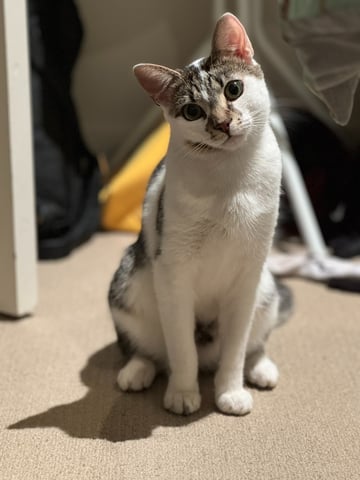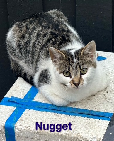 Nugget is a handsome tabby and white teenager with perfect eyeliner eyes and a curious, thoughtful nature who has really blossomed in care. He arrived unsure of people and preferred to observe from a safe distance, quietly watching and studying everything his humans and foster cat friends were doing. With patience, kindness and time, Nugget has grown beautifully in confidence and is now playful, cheeky, interactive and full of delightful kitten personality. He is clever, mischievous, entertaining, affectionate in his own way and wonderfully personable once he trusts you. Nugget loves playing with his foster kitty friend, enjoys interactive play with toys and hands, and is now happily discovering that pats and butt scritches are pretty great too.