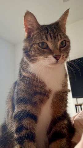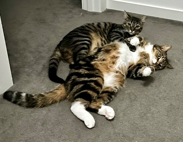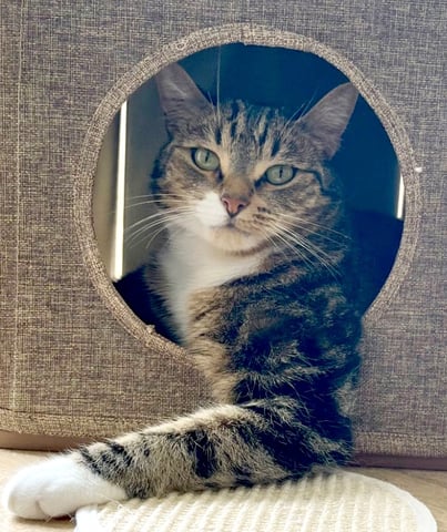 Woody is a 4-year-old short-haired tabby with distinctive swirled markings and cute white socks. He's curious and independent, often found lounging near a window watching the world go by or listening to the birds. While not a fan of being picked up, Woody is a gentle soul who enjoys the occasional pat and will reward you with chirpy little replies when you call his name. He's got a playful streak too and enjoys zoomies and wrestling sessions with his brother when the mood strikes.