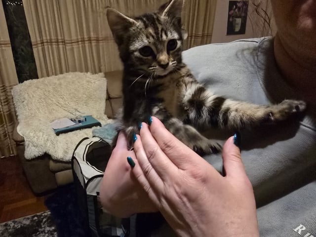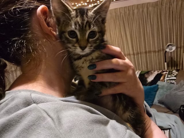 Agnes is a sweet tabby kitten with a calm, gentle presence. She is affectionate and loving, with a slightly more observant nature than her sister, often preferring to watch what's going on before joining in. Once she feels settled, her playful and warm personality shines through, and she happily engages with her surroundings on her own terms.