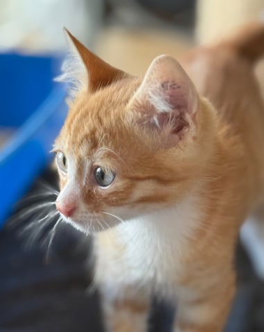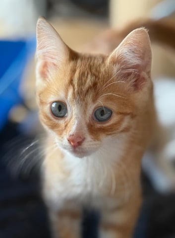 Vulpix is a stunning domestic short hair kitten with very pretty ginger spot stripes, a white chest, muzzle and paws, and the cutest white-tipped tail. At 13 weeks old he still has striking blue eyes, and whether they stay that way or not, they perfectly match his soft, affectionate nature. He is outgoing, cuddly, gentle and incredibly people-focused -- the kind of kitten who wants to be wherever you are, all the time. If he were human he might be described as a stalker, but in Vulpix form it's completely adorable.