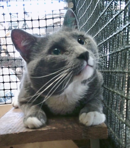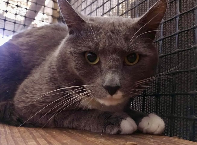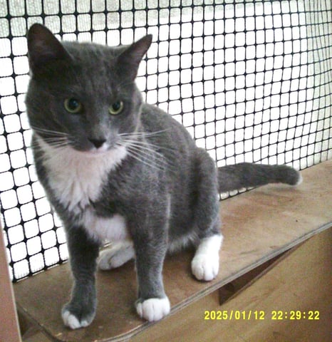 A large, muscular Domestic Short Hair with mostly grey fur and white patches, Dorian is a handsome, solid lad with a big presence and an even bigger heart. He is active, alert, chatty and people-friendly, with a sweet and snuggly side that shines once he feels safe. He loves gentle pats around his face, long strokes down his back, and especially enjoys having his neck and back brushed. If you squat down to his level, he'll happily lean in for affection. He often calls out when he wants attention and is always pleased to see his human come home.