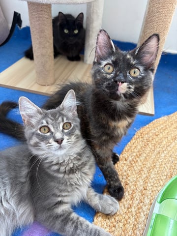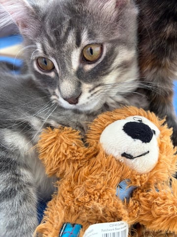 Meet Vinnie Moo, a gorgeous 4-month-old silver and grey tabby kitten with medium-length fur, big paws, and the sweetest lavender nose and toe beans. Vinnie came into care as part of a surprise litter when his mum, Minnie Moo, arrived pregnant without anyone knowing. Since then, he has been growing up safe in foster care, surrounded by love, playtime, and his siblings while he learns all about the world.