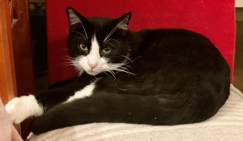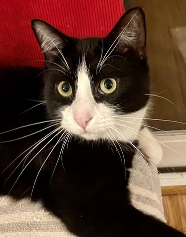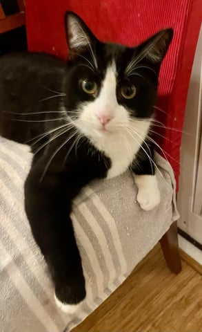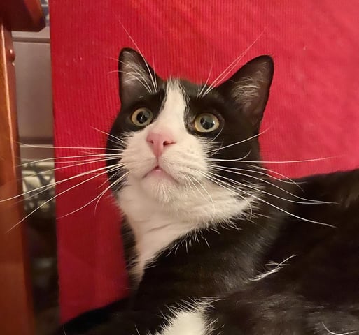 Kazan is a handsome four a ahlf year old black and white tuxedo boy. Pleasantly plump, he loves his food! He enjoys a varied diet of raw meat with no preservatives (Mega Pet Warehouse) canned cat food (likes fish) and quality dried kibble. His coat gleams in good health.