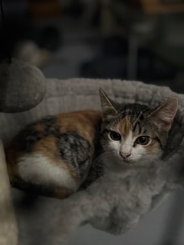A delicate calico with short fur and a petite frame, Baby Spice is as precious as they come. She has a gentle, timid nature and tends to take her time getting comfortable, but once she settles in, her sweet and independent personality shines through.