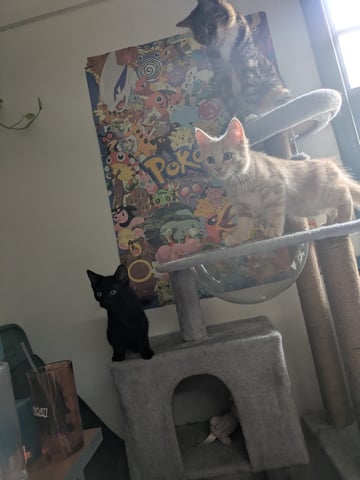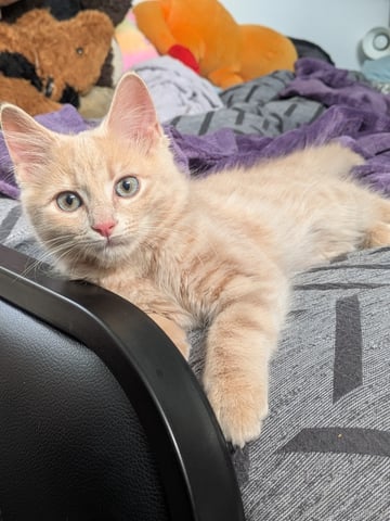 He would do best in a home with another playful cat, as he thrives on feline companionship and interaction. While he can be a little unsure with strangers or sudden movements at first, his confidence builds quickly, especially when food is involved. A home with older children or adults who understand kitten antics and can manage his enthusiasm around food would suit him well.
