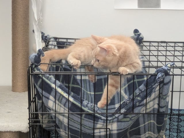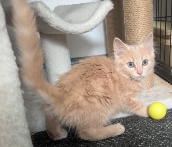 A gorgeous ginger boy with soft, fluffy medium-length fur and subtle stripes, Possum Moo is full of personality. He's playful, chatty, goofy and endlessly entertaining -- the kind of kitten who brings energy and laughter wherever he goes. He's also incredibly food motivated, and it doesn't take much for his love of snacks to override any initial hesitation!