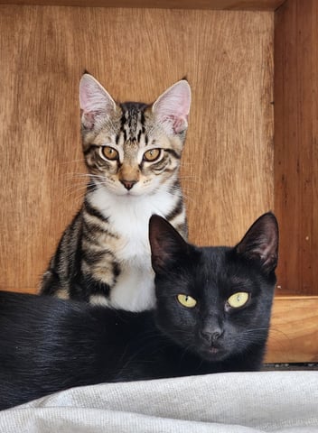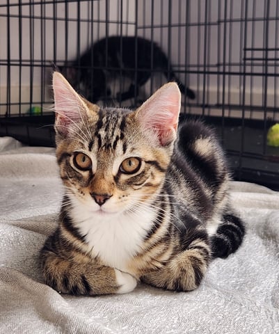 Adey is a playful, soccer-mad kitten who will happily bat toys around for as long as you'll join in. He loves spending time with his siblings, cuddling up after play sessions and soaking up affection from his humans. Pats, playtime and companionship are high on his list of favourite things, and he brings a fun, lighthearted energy wherever he goes. He has no behavioural or health concerns and is described perfectly as a "delightful" little character.