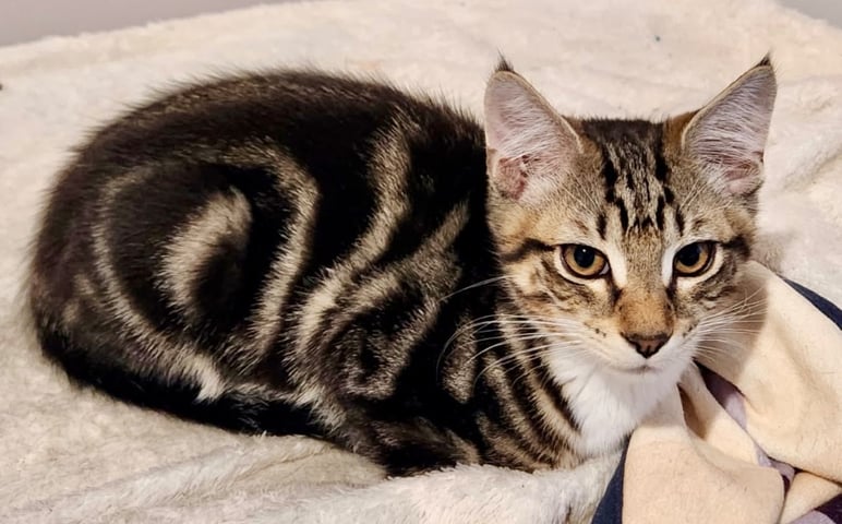 A handsome black tabby with a sandy-coloured nose, white chest, golden eyes and a long tail, Adey is as charming as he is playful. His soft fur and expressive features give him an irresistible appeal, while his relaxed and affectionate nature makes him a joy to have around. He is active, curious and full of personality, always ready for the next game or cuddle.