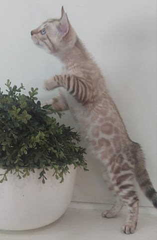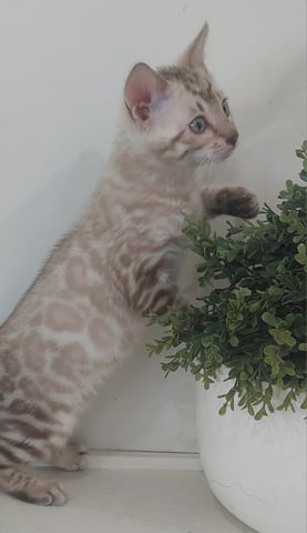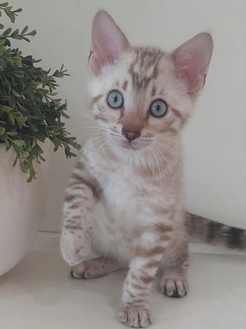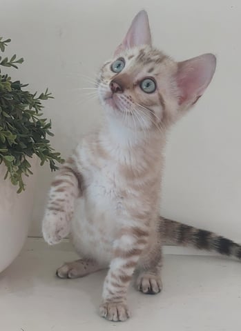 Born and raised in a home-based environment in South West Victoria, this Snow Lynx Bengal kitten is now approaching reservation age. He is confident, curious and interactive, with striking blue eyes and a coat that will continue to develop in contrast as he matures.