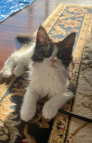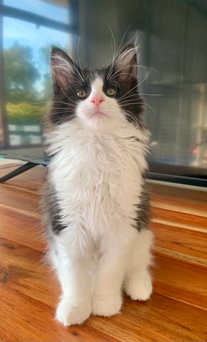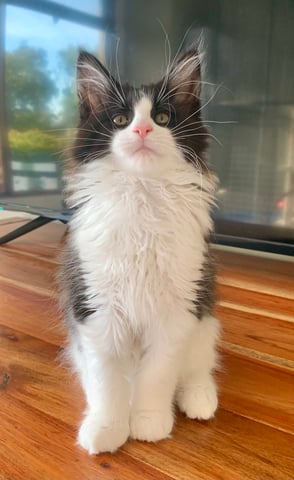 Stunning black and white Maine Coon girl-- happy, healthy, playful kitten ready soon for her forever home.