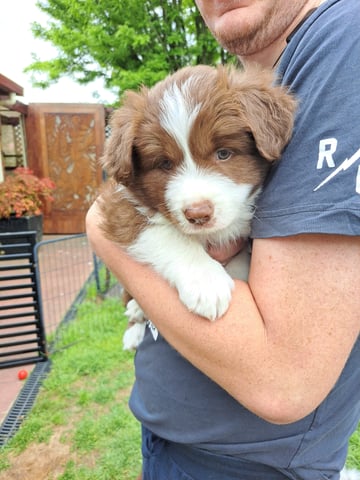 We have one gorgeous chocolate and white male Border Collie puppy looking for his forever home.