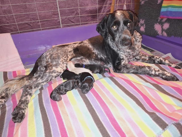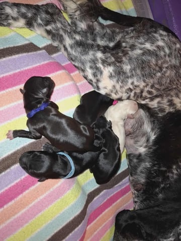 D.O.B. November 26th from Ch Rulett Thcat Thatgot Thcream (A.I.) "Tom" my ee white Boy, and Rulett Rogue Wave (A.I.) "Muriel" my pied/ticked Girl.