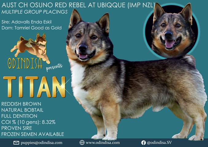 Titan is a carrier (unaffected) for Swedish Vallhund Retinopathy (SVR).